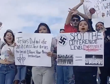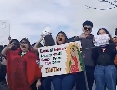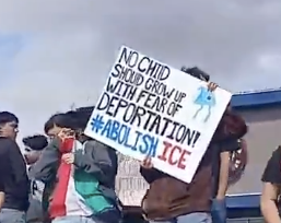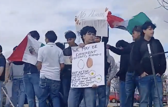 Throughout the clip, students can be heard screaming while holding signs and waving Mexican flags. Many of the protest signs repeat familiar Democrat talking points, while others — like the one pictured above — appear to have been written by the students themselves.
