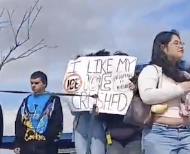 This next sign says, I LIKE MY ICE CRUSHED. Saying “I LIKE MY ICE CRUSHED” isn’t just a harmless pun. It uses language of physical destruction — “crushed” — directed at a law-enforcement agency and the people who work there. That isn’t policy criticism; it’s dehumanizing rhetoric that treats real people as something to be smashed for laughs. If someone held a sign saying “I like my protesters crushed,” it would rightly be condemned as violent and unacceptable. Yet this slogan is waved around as cute because it targets ICE — and because it’s coming from kids.
