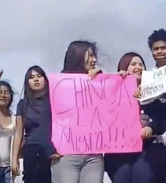 The sign below says, “CHINGA LA MIGRA!!!” — a vulgar Spanish phrase meaning “F* immigration authorities.”