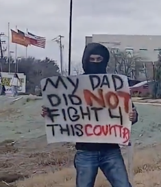 I’m not entirely sure how to interpret this next sign. It says, “MY DAD DID NOT FIGHT 4 THIS COUNTRY.”