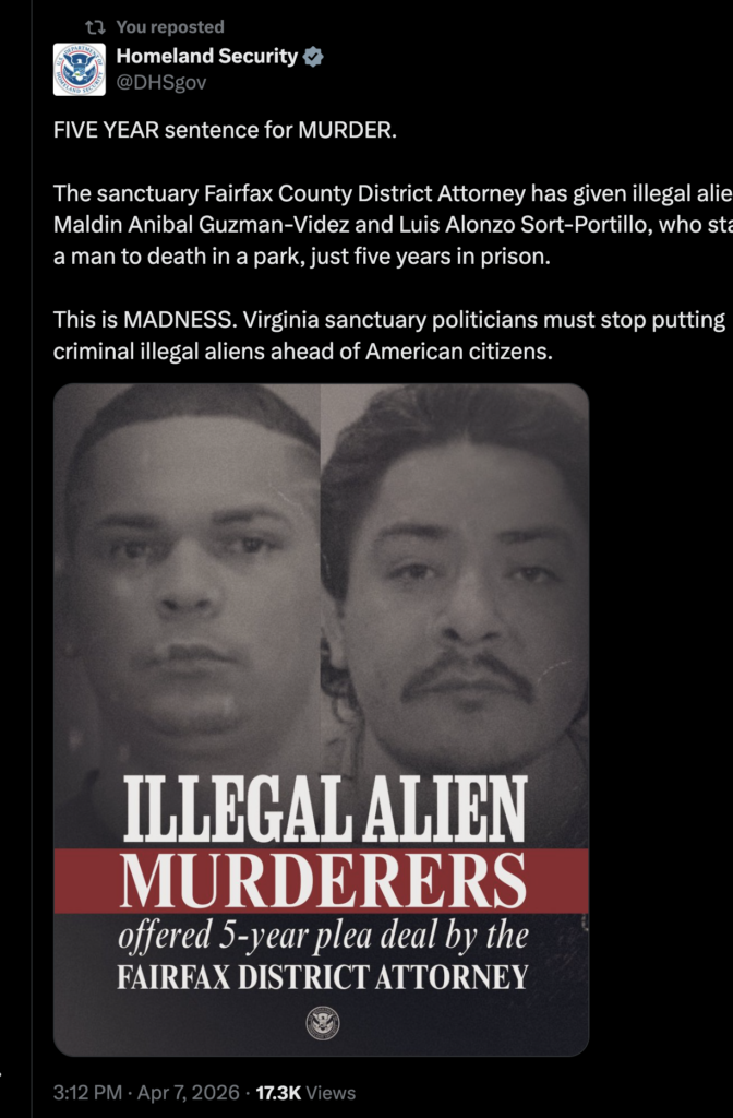 Last week, the Fairfax County District Attorney’s Office offered a 5-year plea deal to illegal aliens Maldin Anibal Guzman-Videz and Luis Alonzo Sort-Portillo, both of whom were convicted of murdering Nicacio Hernandez Gonzalez in July 2024 at a park in Oakton, Virginia.