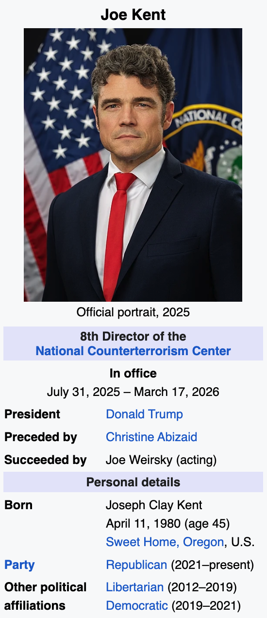 Kent stepped down March 17, 2026, as Director of the National Counterterrorism Center, saying he “cannot in good conscience support the ongoing war in Iran.” In announcing his resignation, Kent added that Iran “posed no imminent threat to our nation” and said the war was started “due to pressure from Israel and its powerful American lobby.”