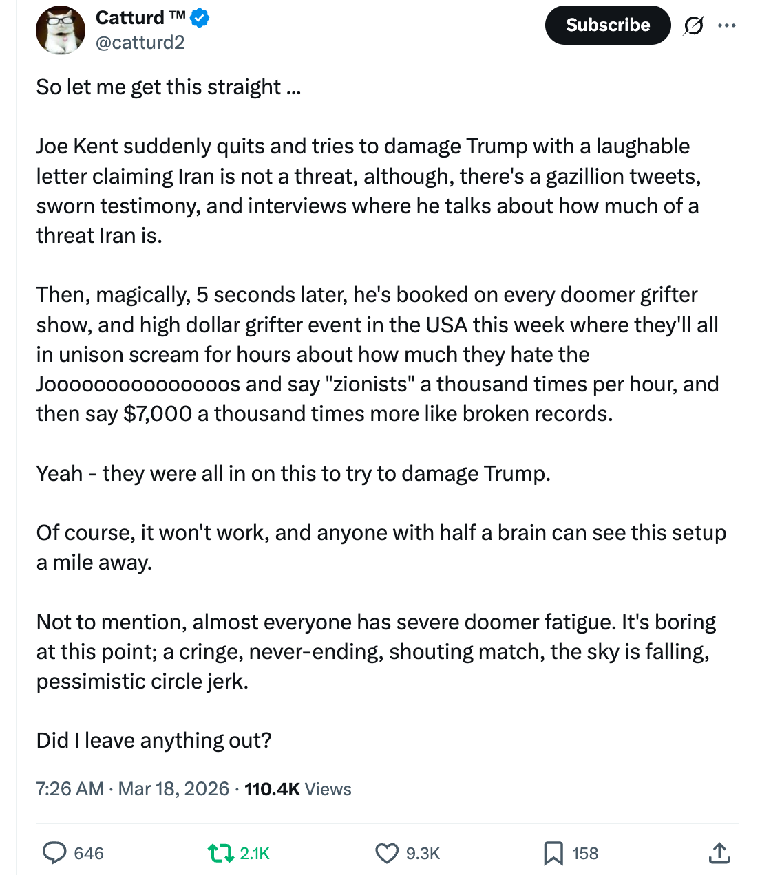 The stance contrasts with Kent’s earlier public posts on X, where he described Iran as a significant threat and advocated for direct action against its military capabilities.