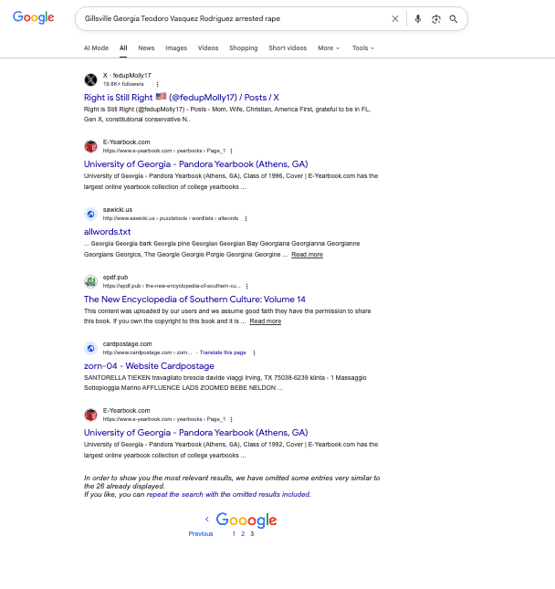 And the one local news outlet that reported this story says this about his immigration status at the very end of the article: “Vasquez Rodriguez is being held in the Hall County Jail without bond as of Tuesday, Jan. 27. He faces charges of child molestation, sexual battery, and grooming a child for indecent purposes. He is also being held on an immigration hold.”