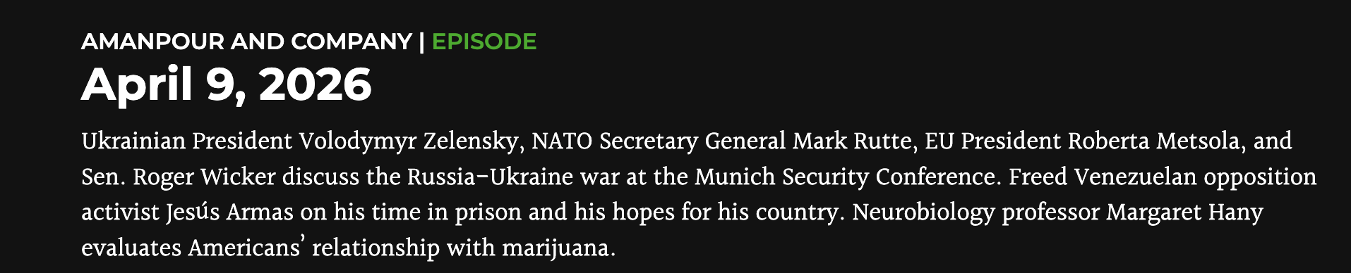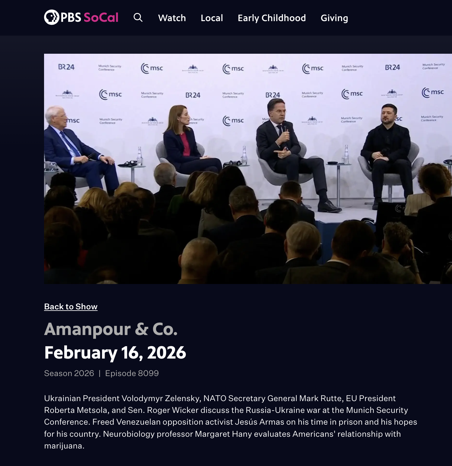 As shown on the official PBS pages, it included roughly 25 minutes from the Munich Security Conference panel focused on Zelensky, the full 18-minute marijuana discussion with Dr. Margaret Haney, “Does the U.S. Have a Marijuana Problem?”, and the interview with freed Venezuelan political prisoner Jesús Armas — all of which originally aired on February 16. Viewers expecting fresh journalism got a rerun from two months earlier.