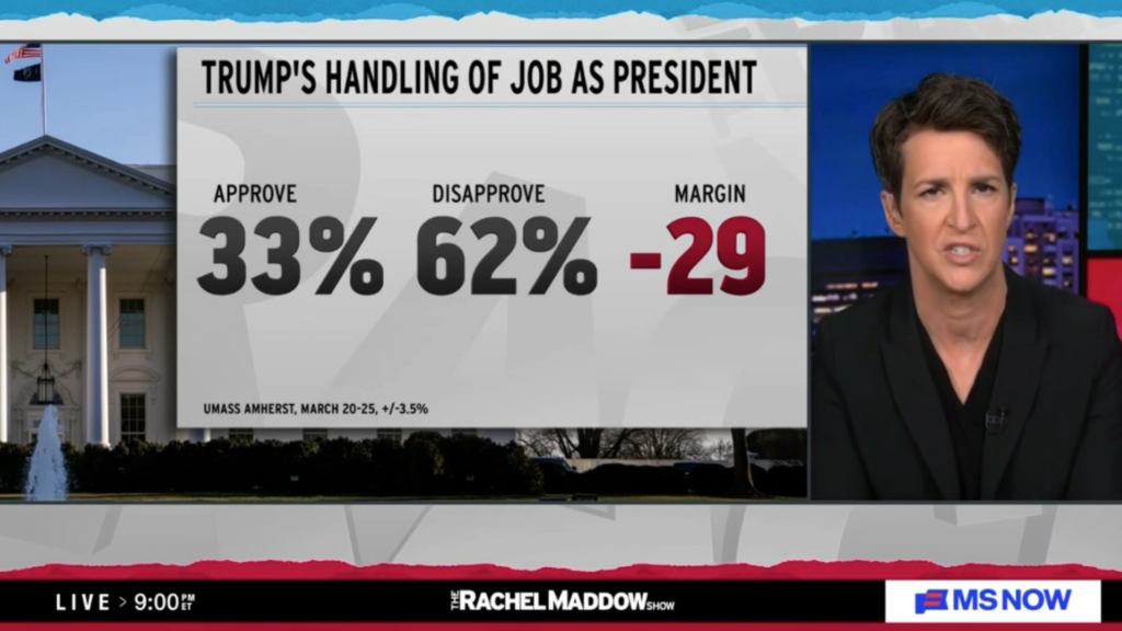 Rachel Maddow opened her show by highlighting the UMass Amherst/YouGov poll showing President Trump’s approval rating at just 33% — the lowest figure among recent major national surveys. The poll comes from the University of Massachusetts Amherst’s political science department in Amherst, a very liberal college town in the solidly deep-blue state of Massachusetts, which has voted Democratic in every presidential election since 1988. It is directed by Tatishe Nteta, whose research focuses heavily on race, ethnicity, public opinion, and racial attitudes.