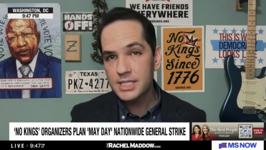 Rachel Maddow gets paid $25 million a year to promote and glorify anti-Trump, anti-law-enforcement protests. Every time I tune into her show, she praises Democrat-organized demonstrations and strains to portray them as the biggest in human history. But footage shows mostly elderly white liberals and committed left-wing activists—not some spontaneous uprising of “the people.” … Continue reading Rachel Maddow Promotes No Kings Organizer Ezra Levin And Their May 1 General Strike, Calls ICE “Goons” Terrorizing City