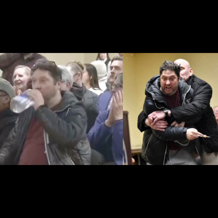 This man was allowed into the event carrying a water bottle and what appears to be a syringe, which raises an obvious question: do they not vet or screen people before letting someone sit this close to a member of Congress? If a crazy looking man can sit in the front row with a water bottle and a syringe and then spray liquid toward a sitting congresswoman, that is a clear security failure — or it was staged.