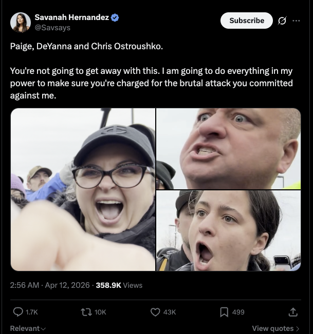 Savanah Hernandez is a real reporter and a contributor to Turning Point USA (TPUSA). Watch her get assaulted at a Minneapolis anti-ICE protest by a family of three. And remember, the violent psychos who assaulted her are the same people who hate ICE. They are all a bunch of criminals, just like the illegal aliens they support.