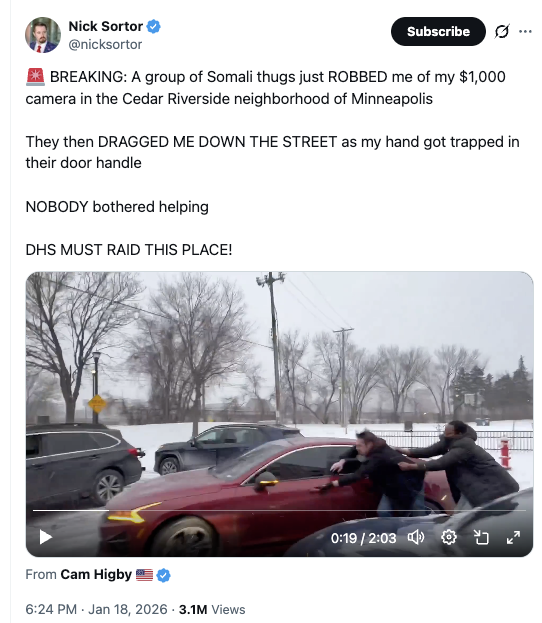 WATCH: Somali Thugs Steal Nick Sortor’s $1,000 Camera Leave a Comment / Uncategorized / By Expose / 01/19/2026 Nick Sortor posted this on X. WATCH video he posted below. Watch on YouTube Watch on Rumble