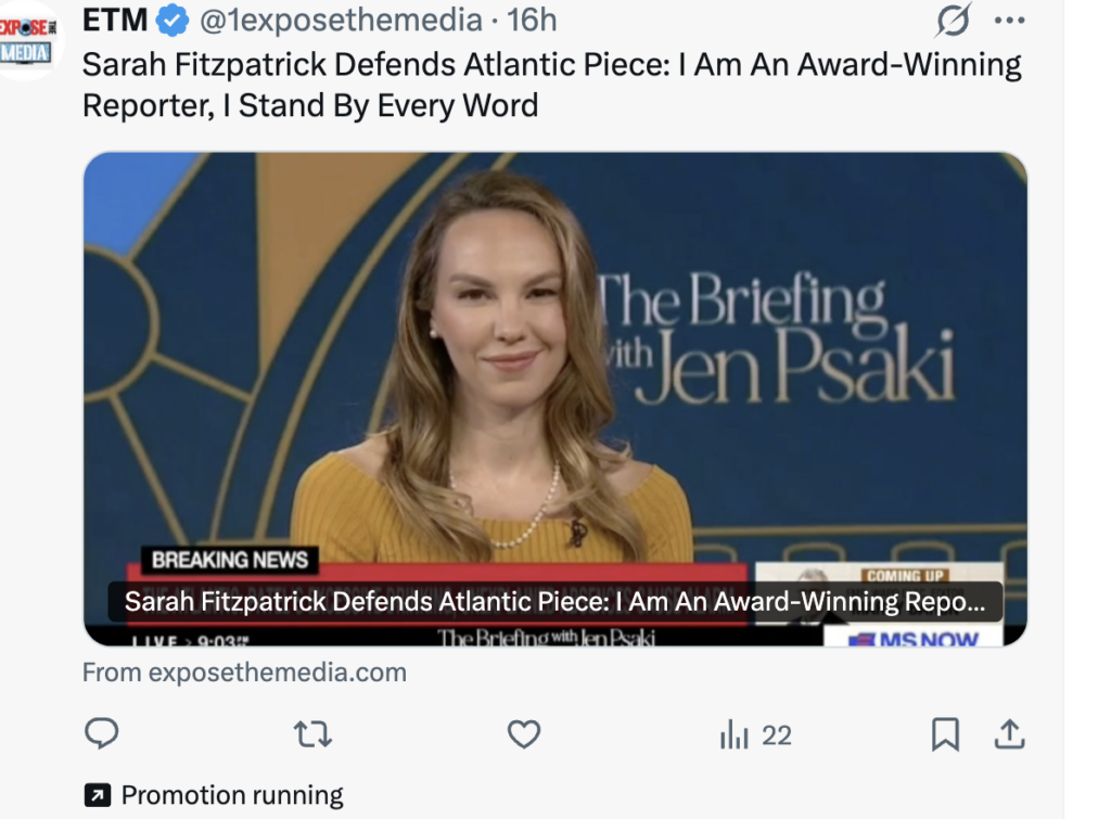 I promoted the post shown 24 hours ago. Even though X makes it look like the promotion is running, it says the post has reached only 22 people. Most, if not all, of those views are me.